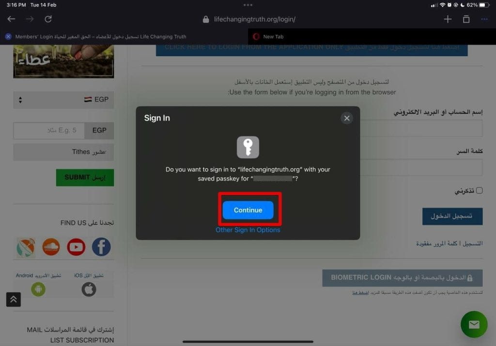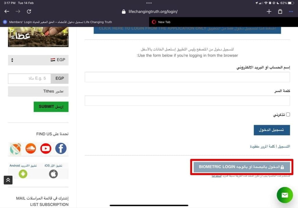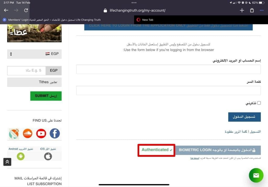6- بعد اضافة الطريقة يمكنك تسجيل دخول من أي متصفح (بشرط يكون من نفس الجهاز Device) … من صفحة تسجيل دخول اضغط على زر “الدخول بالبصمة”