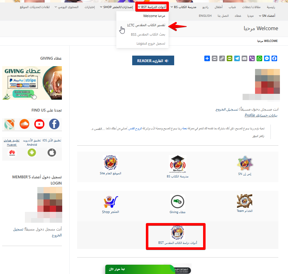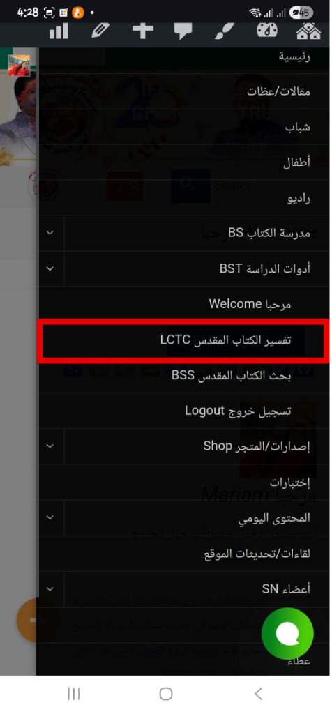 3. يمكنك الوصول لتفسير الكتاب المقدس من صفحة “مرحبا” او من القائمة.