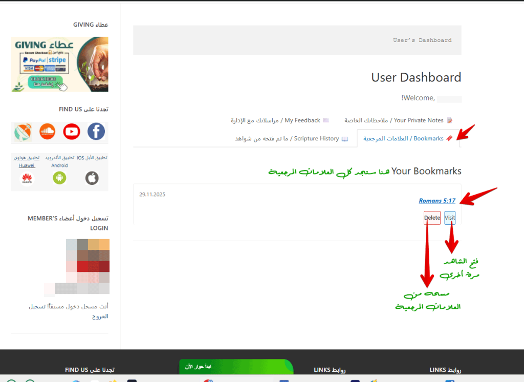 كمثال: الضغط على “العلامات المرجعية”سيظهر المحتوى بداخلها، ويمكنك زيارته مرة أخرى أو مسحه.