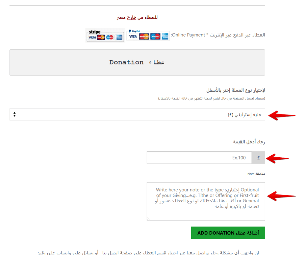 4- هنا اختر العملة واكتب القيمة التي تريد إعطاءها وأي ملاحظات (عشور/تقدمة/باكورة) ثم الضغط على زر “إضافة عطاء”.